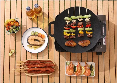 C'est un plat de cuisson rond multifonctionnel qui peut être utilisé en camping et en barbecue en plein air pour cuisiner des rôtis aux sautés, comme du ventre de porc, des crêpes, des galettes de riz frit, des côtes, de la viande frite, etc., et conserver le goût, l'arôme et la nutrition d'origine des aliments.